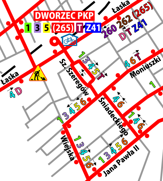 Autobusy linii 1, 3 i 5 z Dworca PKP pojadą ulicami: Szarych Szeregów, Moniuszki, Wiejską i dalej swoimi stałymi trasami. Analogiczna zmiana trasy obowiązuje w przeciwnym kierunku.