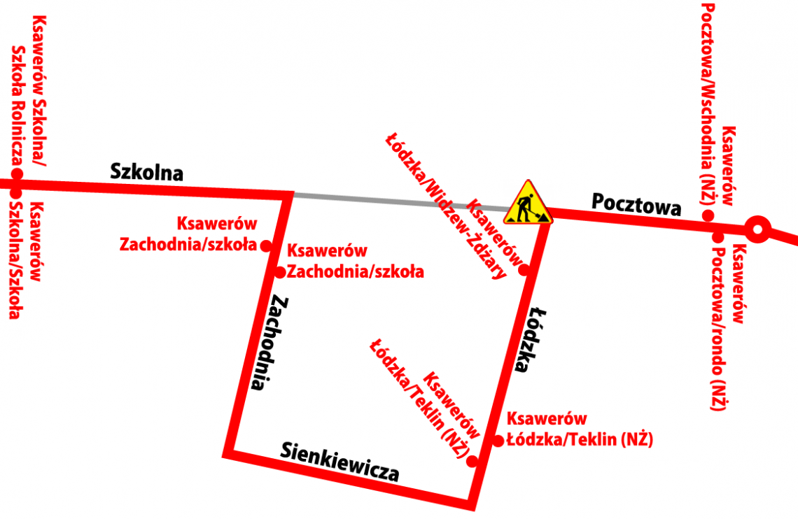 Autobus pojedzie z Waltera-Jankego bez zmian do ul. Jana Pawła II, dalej objazdem ulicami: Zachodnią, Sienkiewicza i Lódzką do Pocztowej, następnie stałą trasą do Urzędu Gminy Ksawerów. Analogiczna zmiana trasy obowiązywała będzie w przeciwnym kierunku.