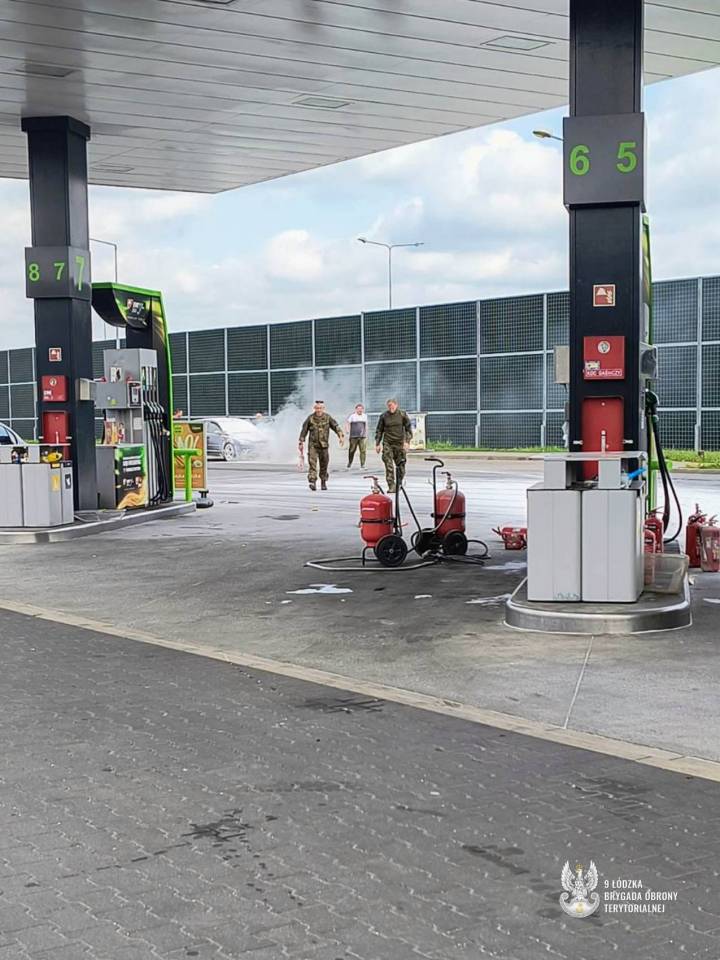 Bezpośrednio przed dystrybutorem paliwa zapalił się samochód osobowy. Na pomoc natychmiast ruszyli st. szer. spec. Krzysztof, st. szer. spec. Filip, ppor. Konrad oraz ppor. Tomasz. Żołnierze 9ŁBOT, nie zważając na zagrożenie, podjęli skuteczną akcję gaśniczą, a następnie przepchnęli dymiący pojazd w bezpieczne miejsce, kontynuując gaszenie do czasu przyjazdu straży pożarnej. Cała akcja trwała około 20 minut, zużyto 10 gaśnic w tym 2 agregaty. W międzyczasie obsługa stacji zamknęła jej działanie, a na miejsce została wezwana straż pożarna, która przejęła dalsze działania.